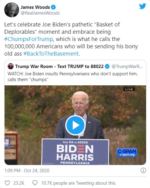 As conservatives/Trump supporters did in 2016 after Clinton's screwup, they started a hashtag, taking the chump "insult" as a badge of honor and started the #ChumpsForTrump, with actor James Woods joining in on the fun.