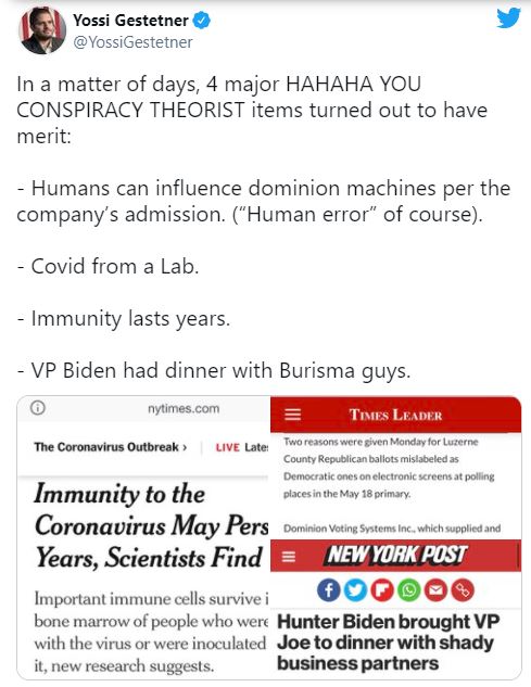 Now after hundred or even thousands have been blocked, banned, shadow banned, terminated and censored by YouTube, Twitter and Facebook, over their vaccine coverage, or COVID origin coverage or Hunter Biden coverage, we see these topics are now being openly talked about after the truth, which those darn "conspiracy theorists" were censored from sharing before, was exposed.